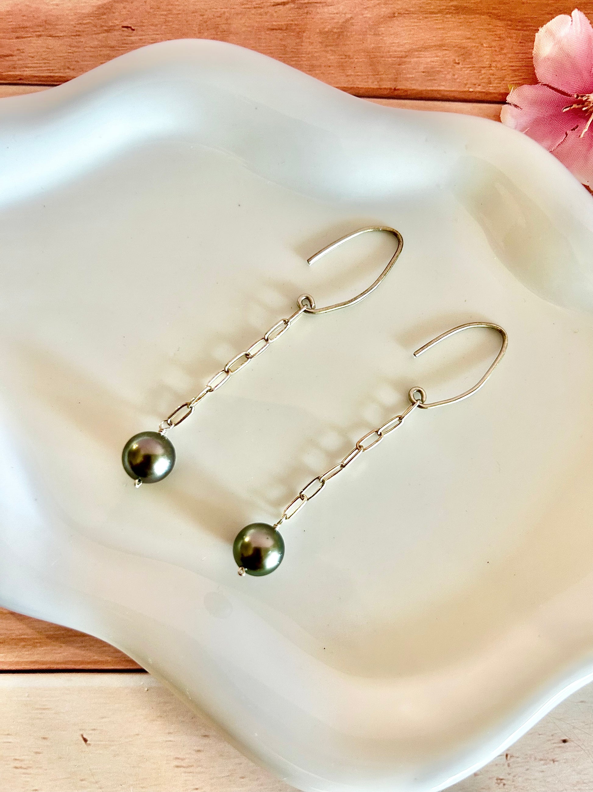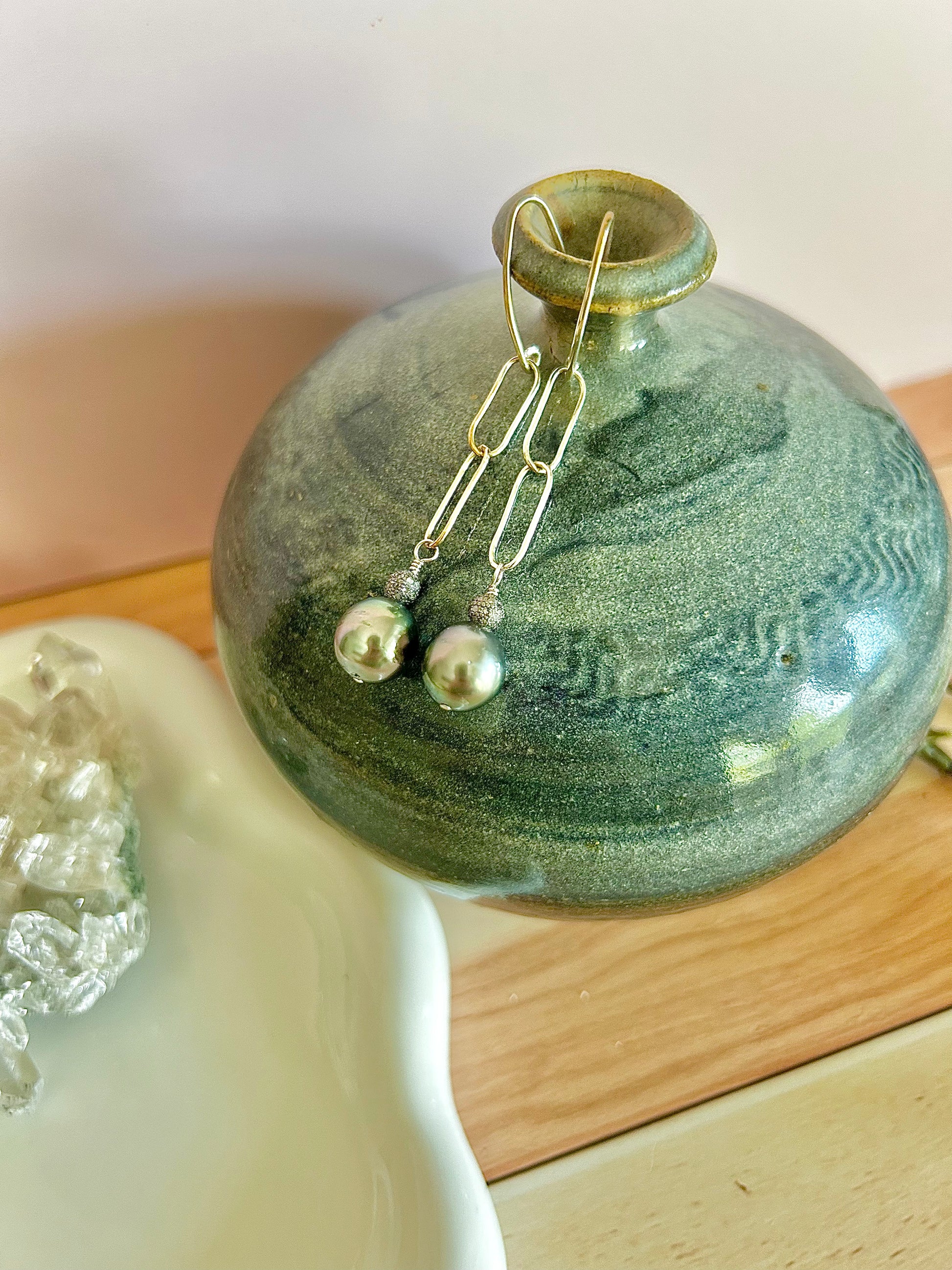 Hand wired paperclip chains which radiate femininity and class. Adorned with a high luster Tahitian Pearl and delicate pave diamond. Worn with confidence and poise.