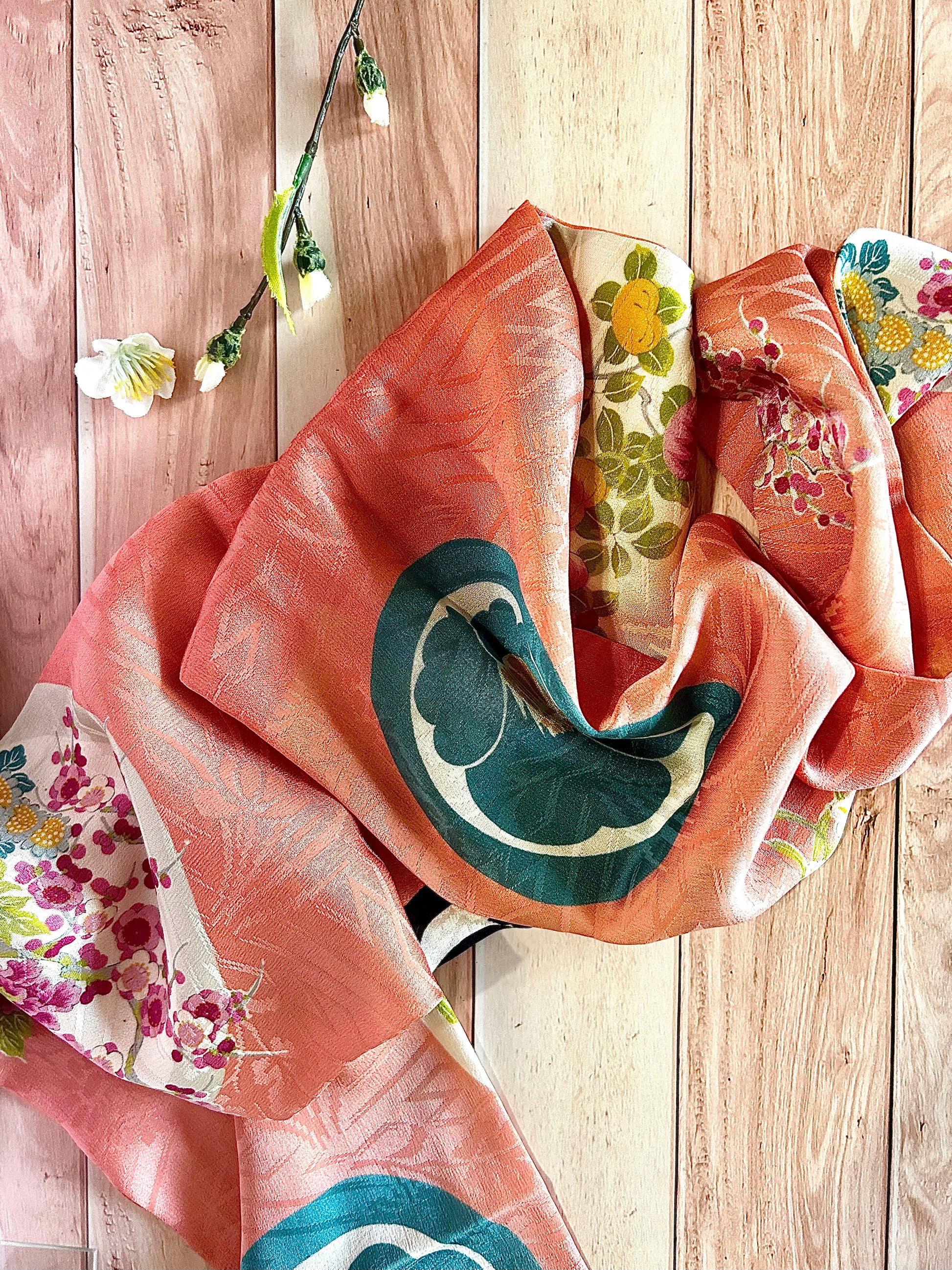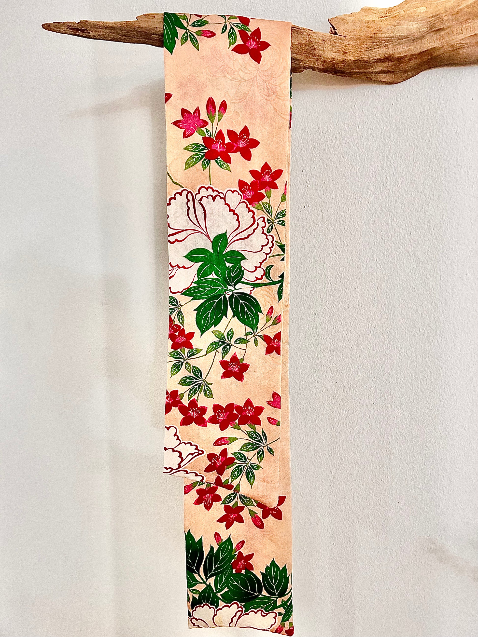 Beautiful hues of soft orange and green and adorned with cherry blossom trees. This elegant and stately vintage sash scarf adds the perfect accent to any outfit.