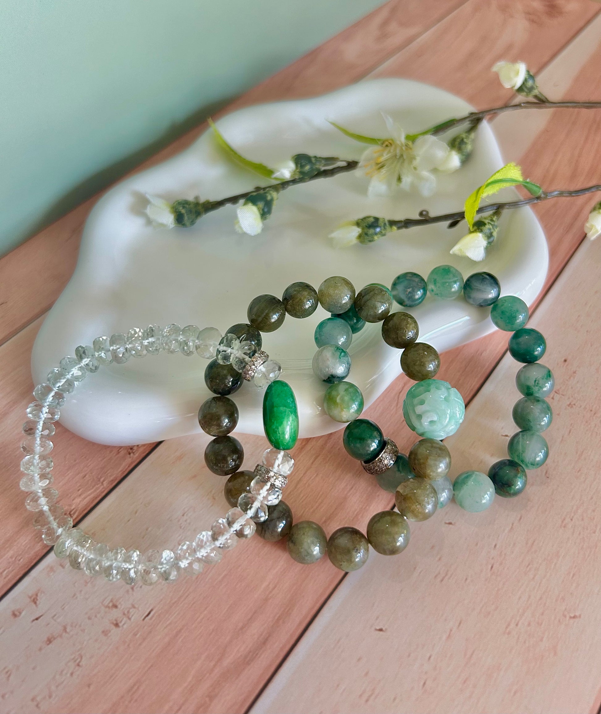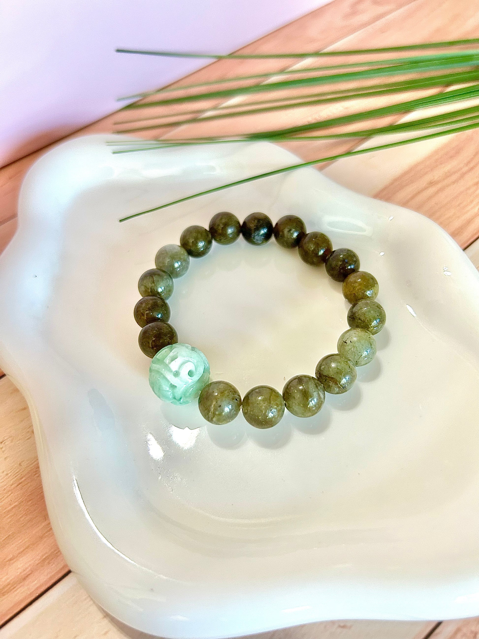 Bringing good luck and prosperity to the wearer, the focal point of this bracelet is a large, carved vintage jade bead. Intricate and mesmerizing, it holds deep spiritual meaning and guidance. A statement piece for the bold and aligned individual.