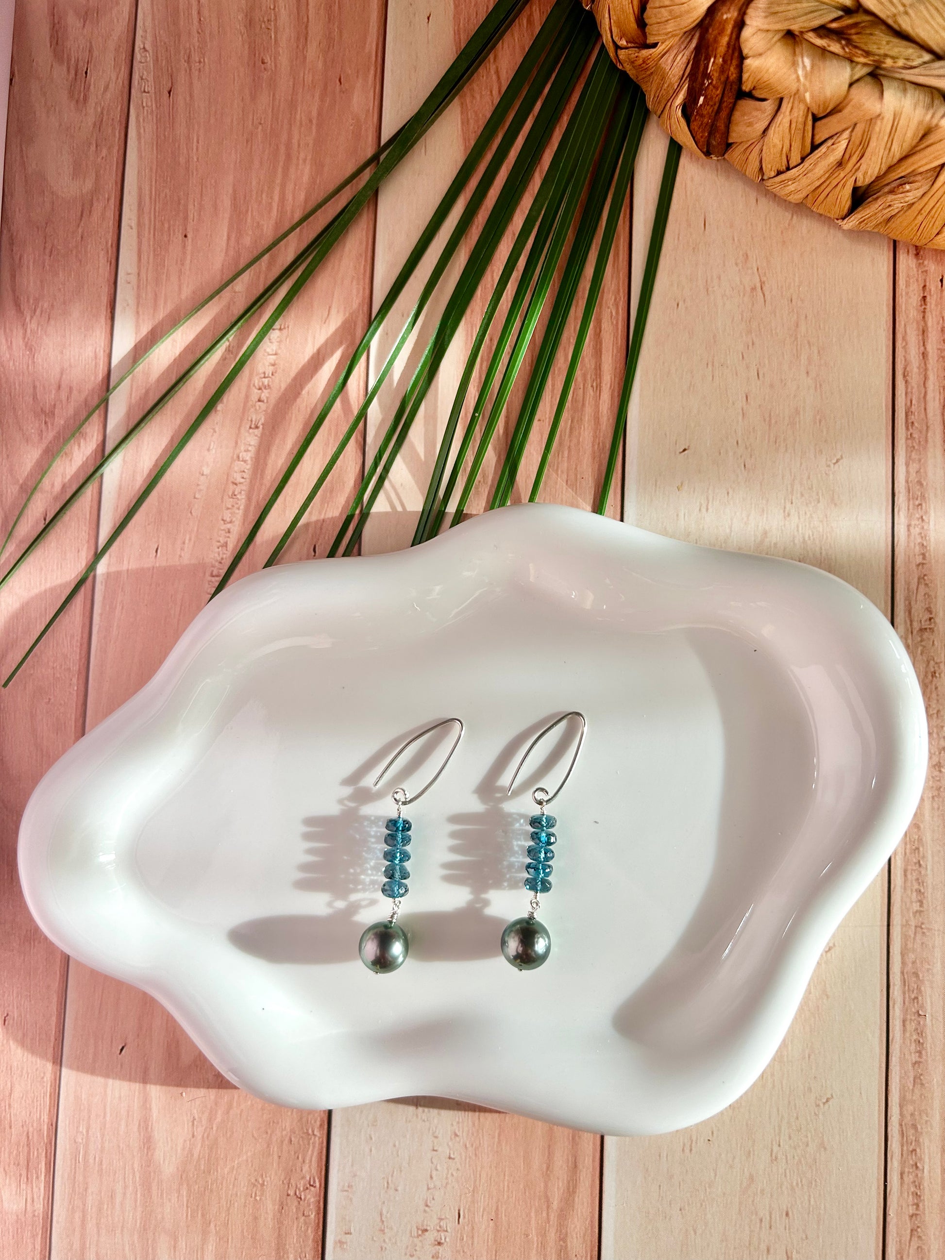 Another original Chiyomi Designs piece. Centered around a high lustre Tahitian pearl, drops of london blue topaz add a quality of serenity. Like water droplets over natural pearl this piece is the essence of timeless beauty.