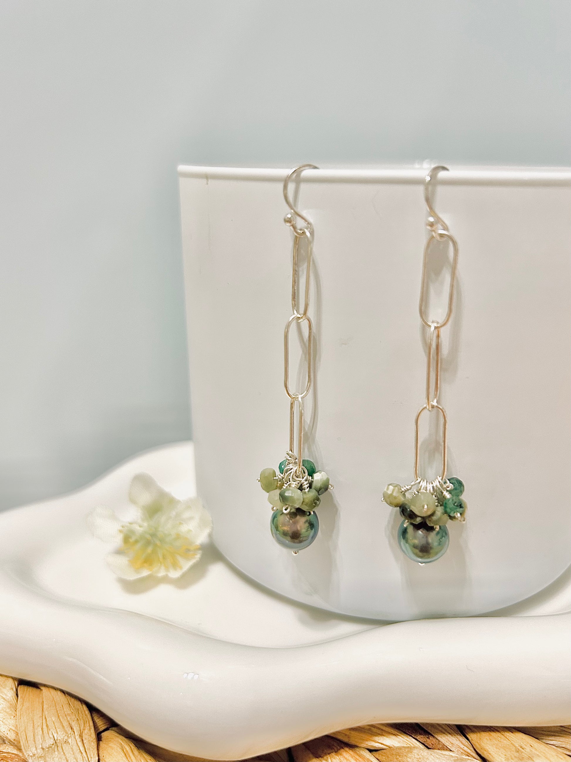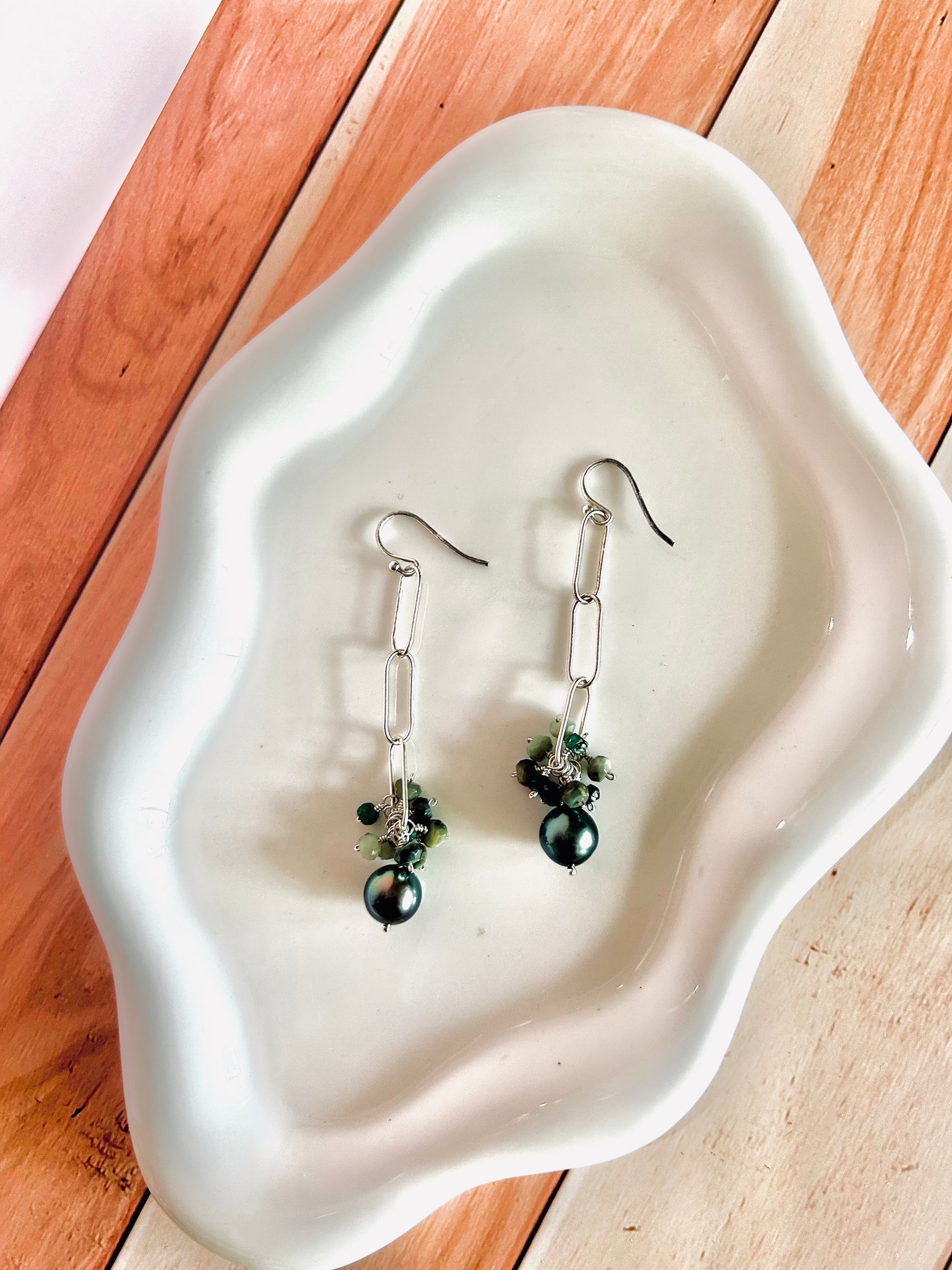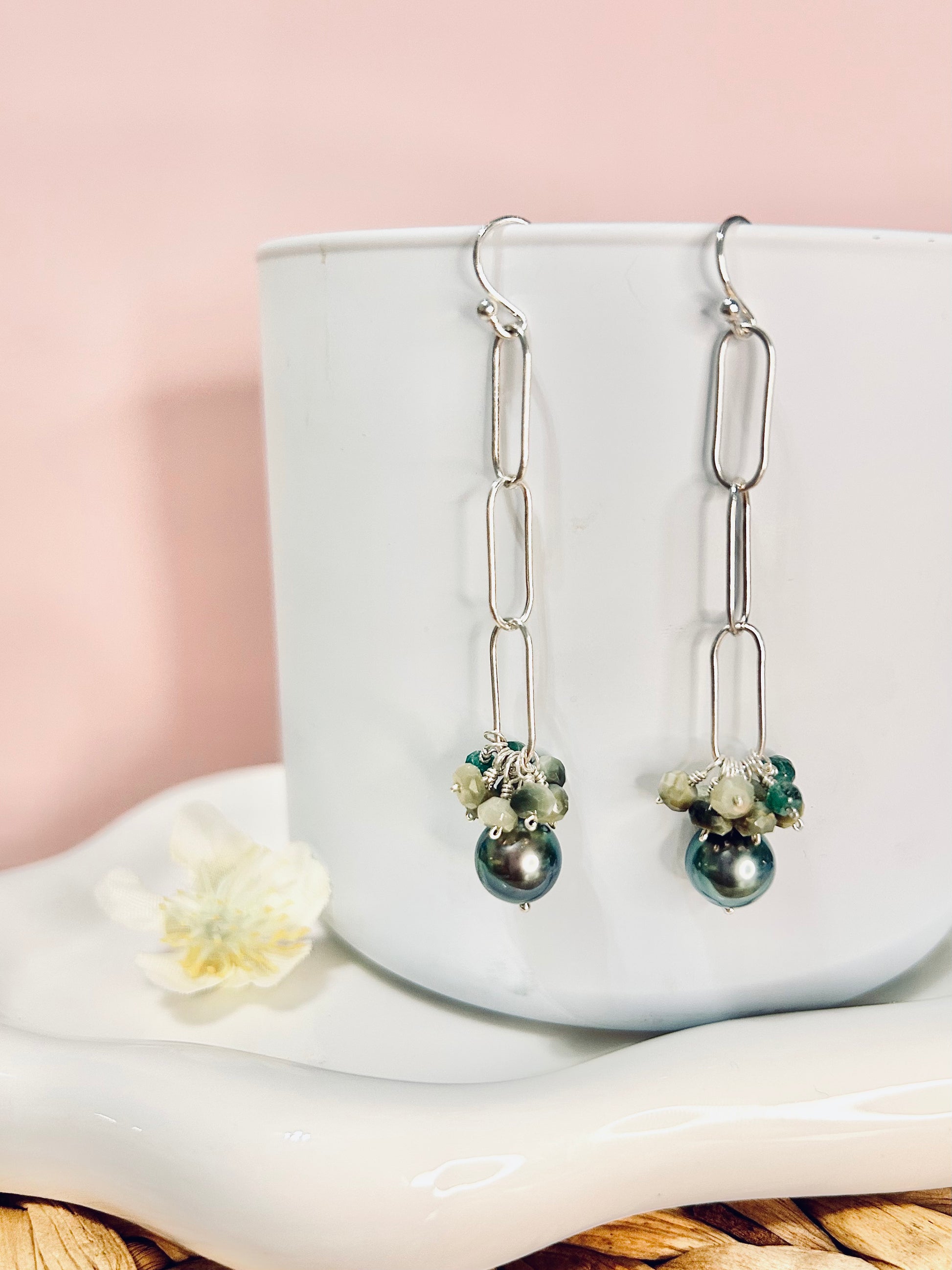 Kaito in Japanese means sea or ocean, inspiring the deep ocean water colors of this design. Grounded with a Tahitian pearl, gentle cascade gemstones add a delicate and meaningful touch.