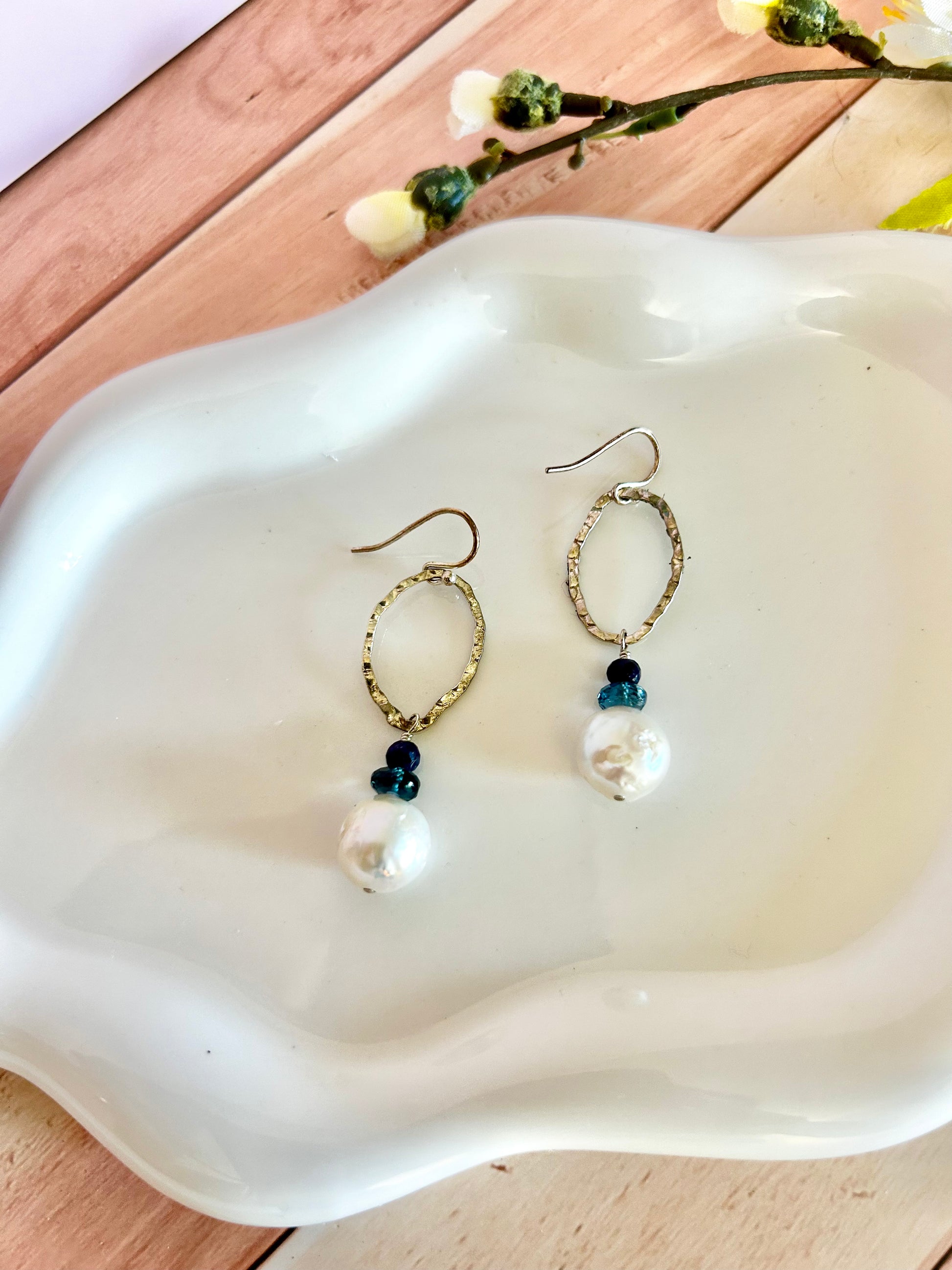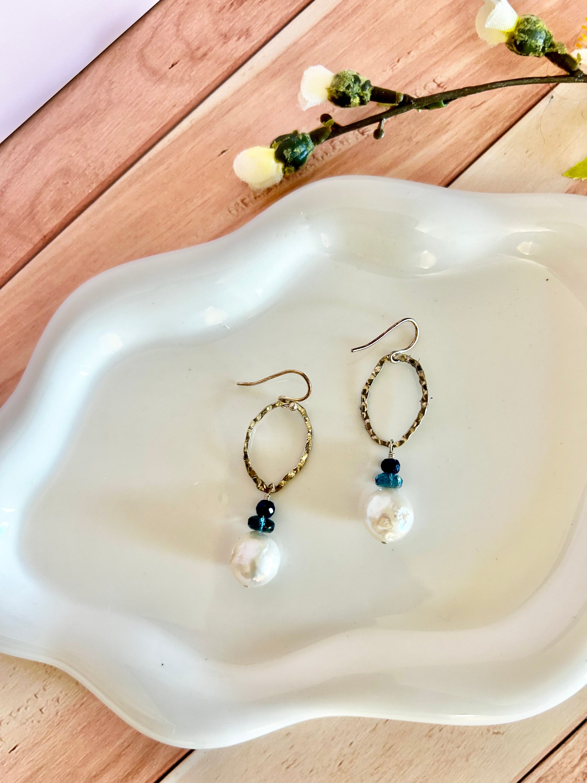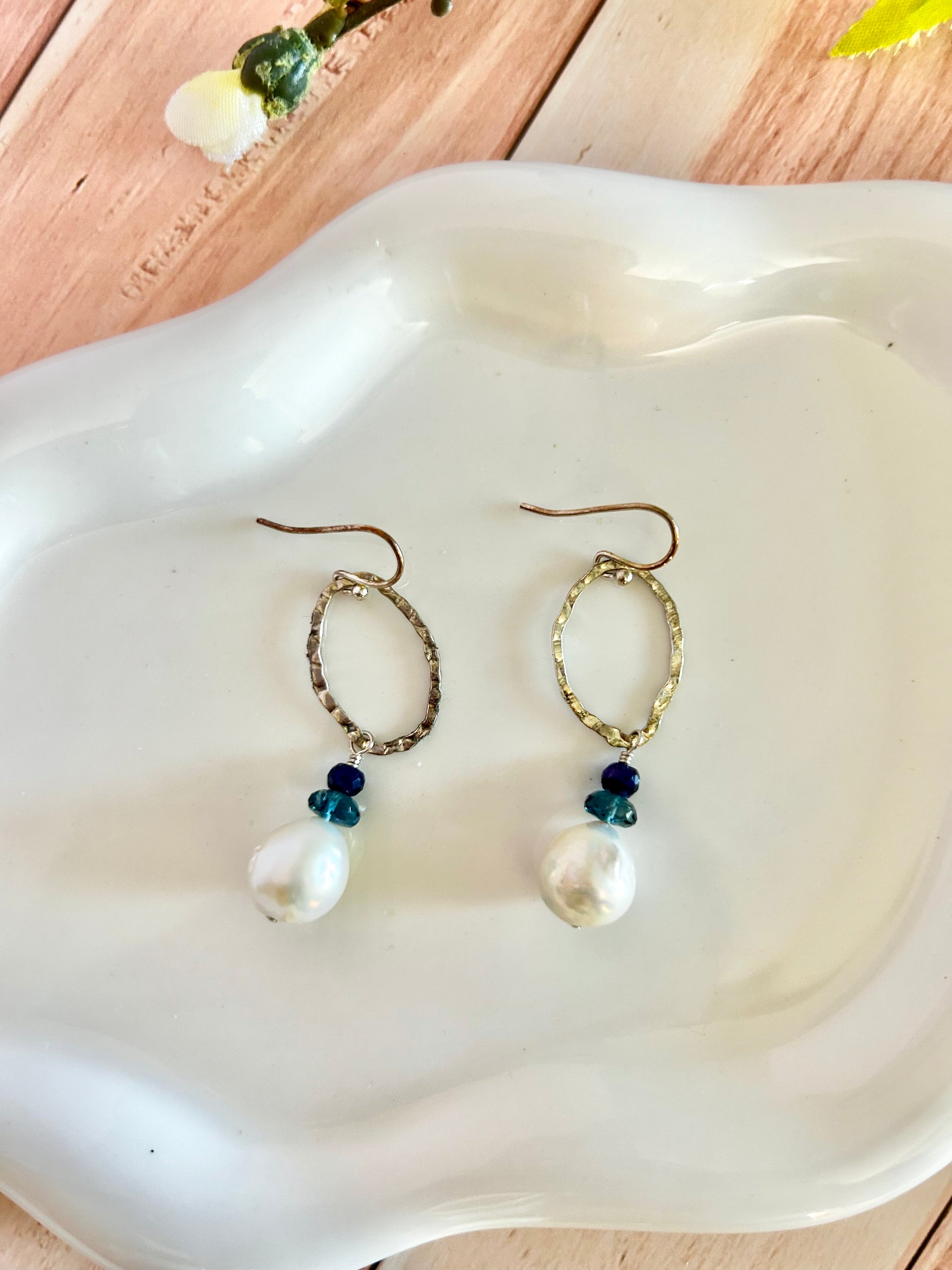 Kalani, meaning sea in Hawaiian dialect, this pair of earrings has two large fresh water pearls accented with rich gemstones. A sterling silver hammered oval accent adds another element of elegance and wave like features.