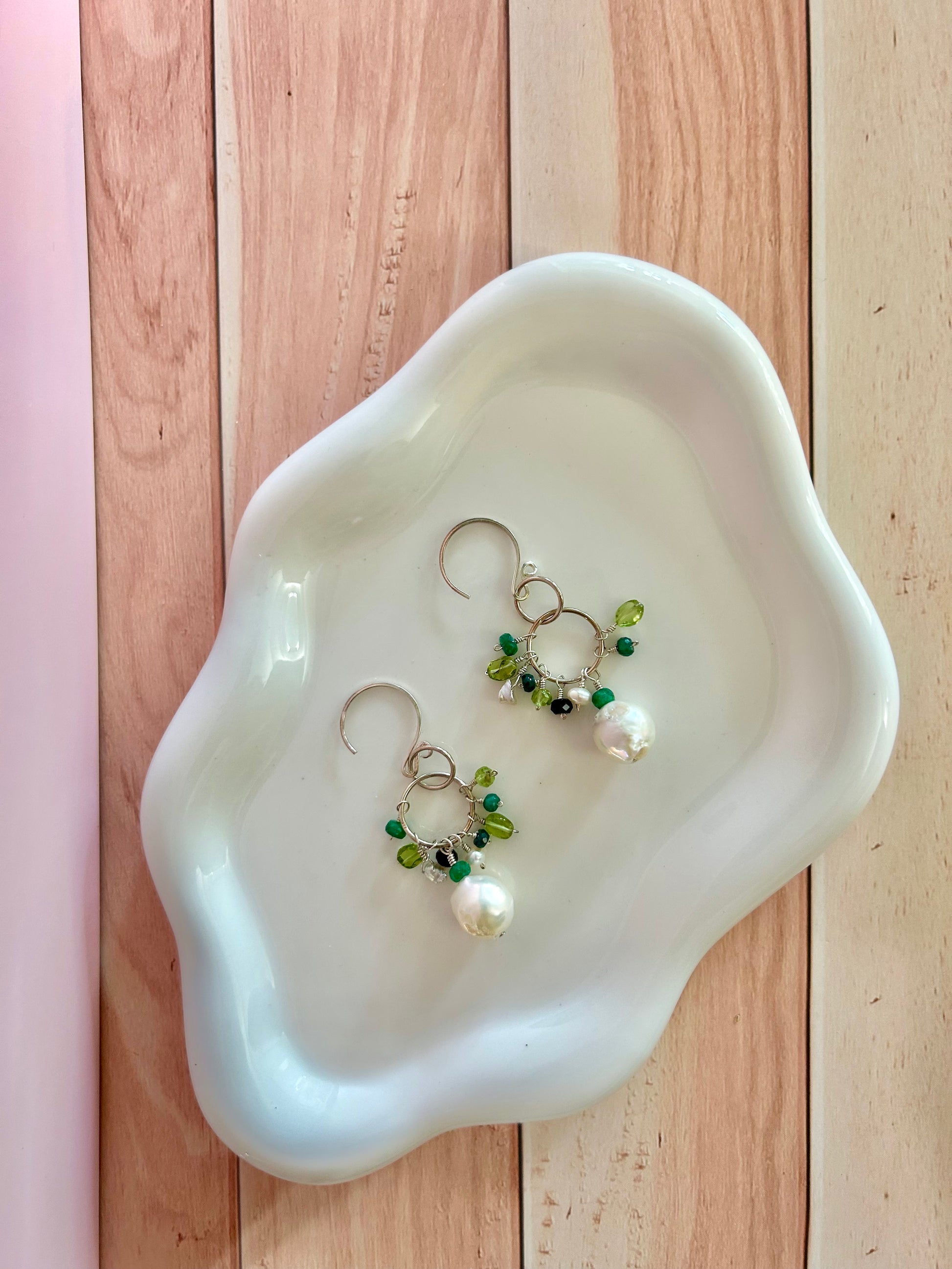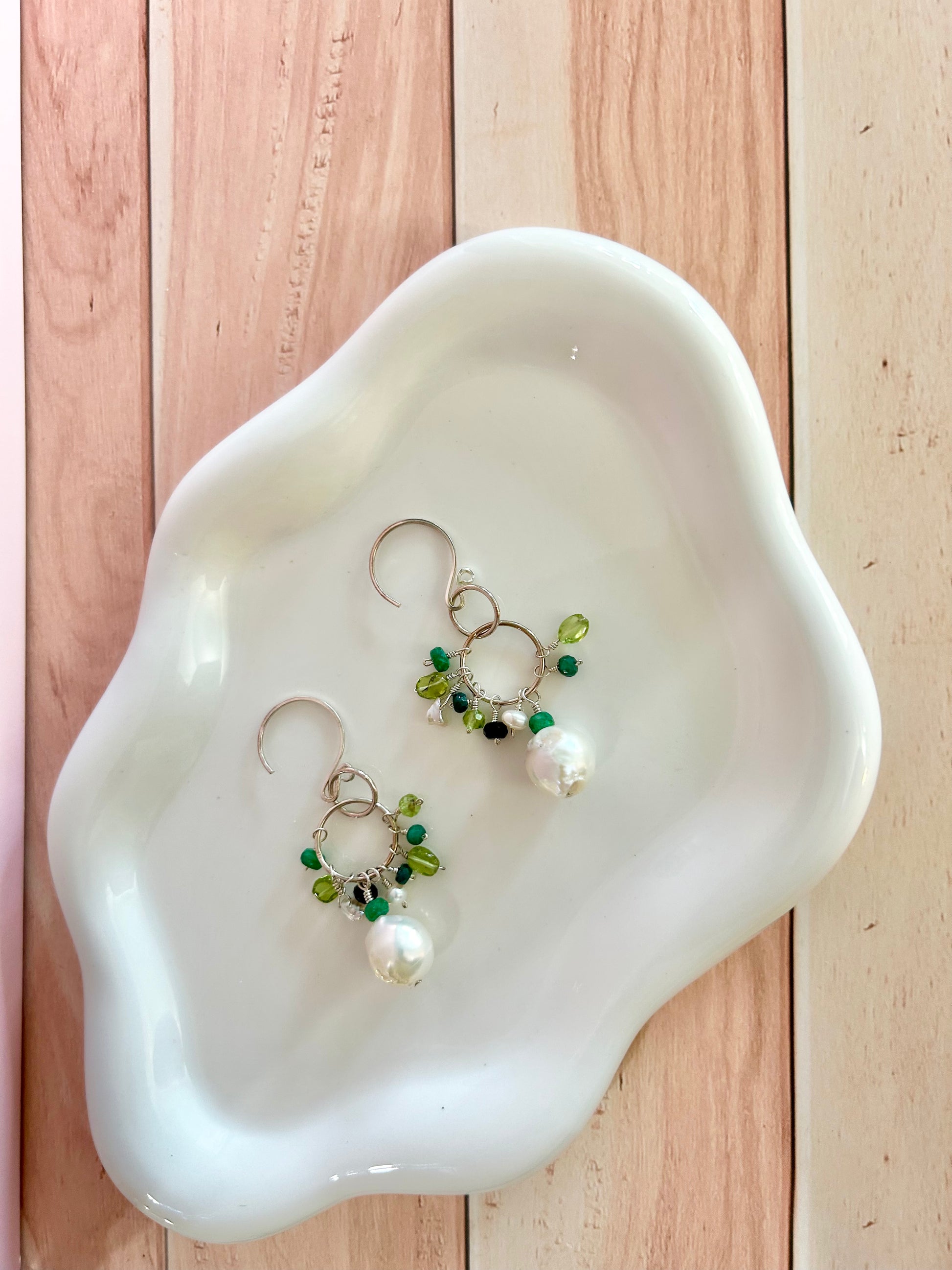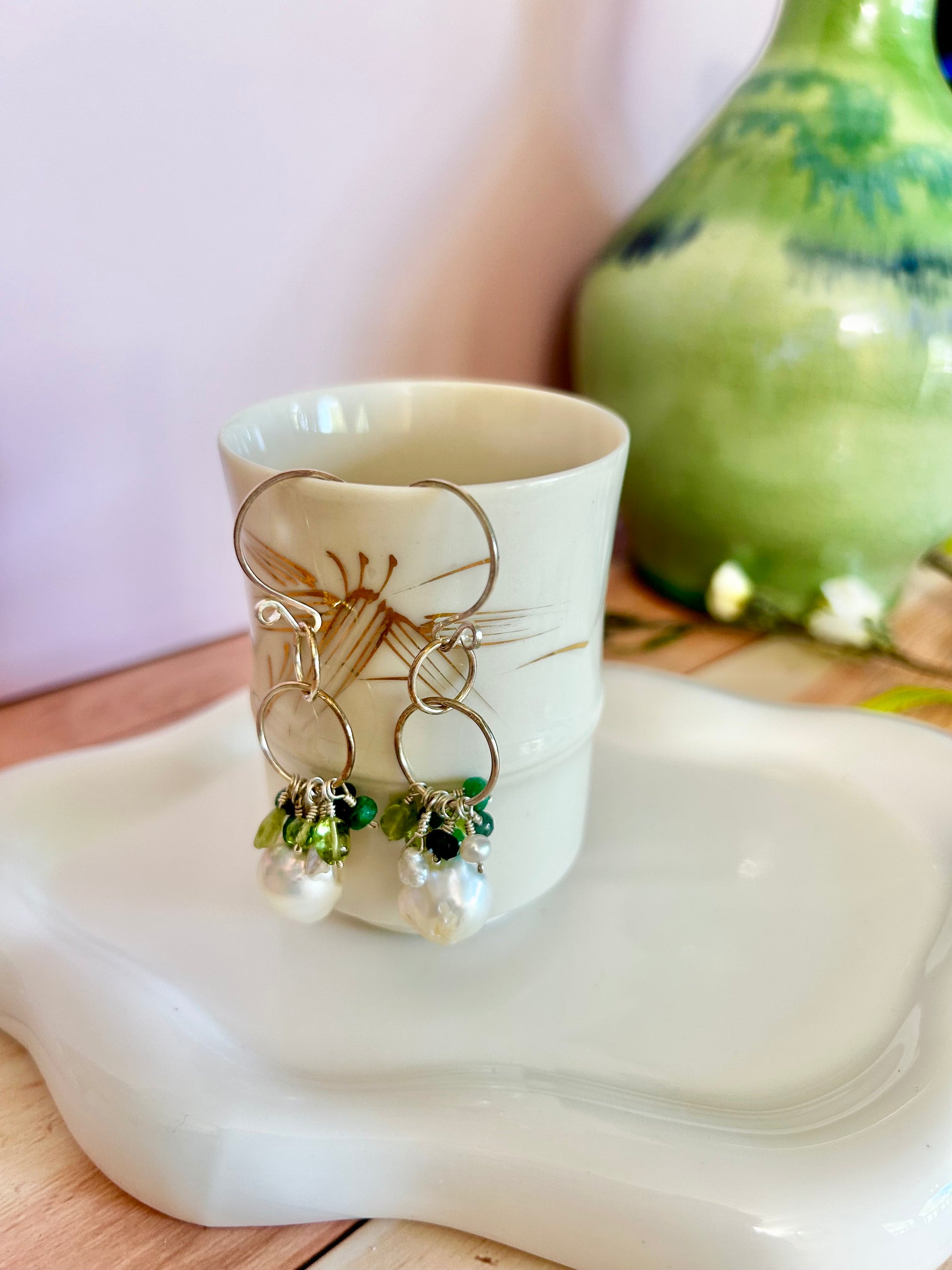 Soft and feminine, this pair of earrings boasts two large fresh water pearls in a natural shape. Soft green hues of peridot cascade over the pearls feeling the essence of nature itself. A lovely accent to any outfit.