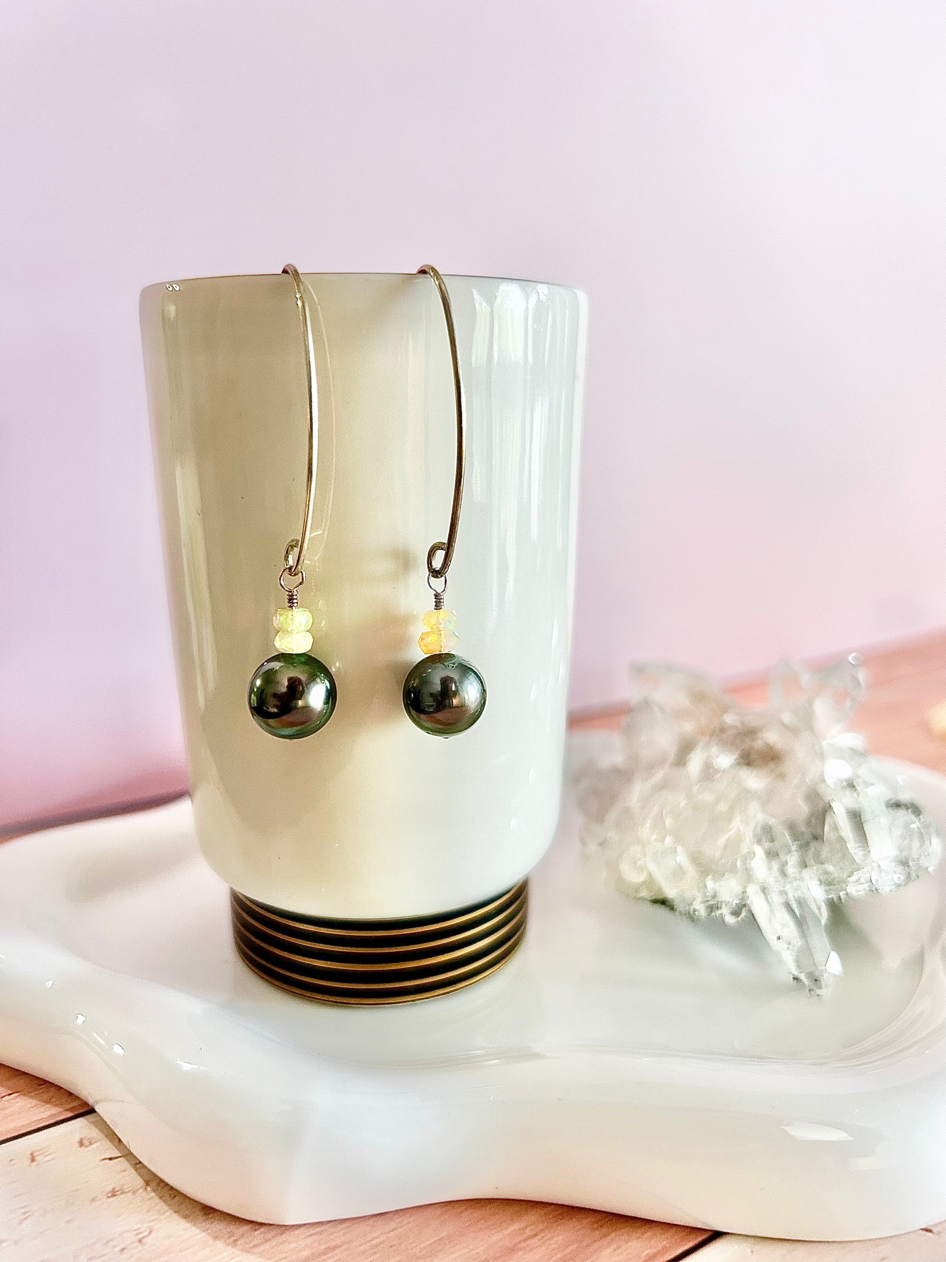 A sophisticated design, sleek and simple. Highlighting the beauty of the Tahitian Pearl and a splash of iridescent color with the double stack of Ethiopian opal.